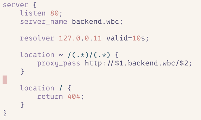 One config acts as a proxy, changing the url path from http://backend.wbc/v1/xxx to http://v1.backend.wbc/xxx to be able to connect to the appropriate machine, as they are defined by their hostnames in the compose file.