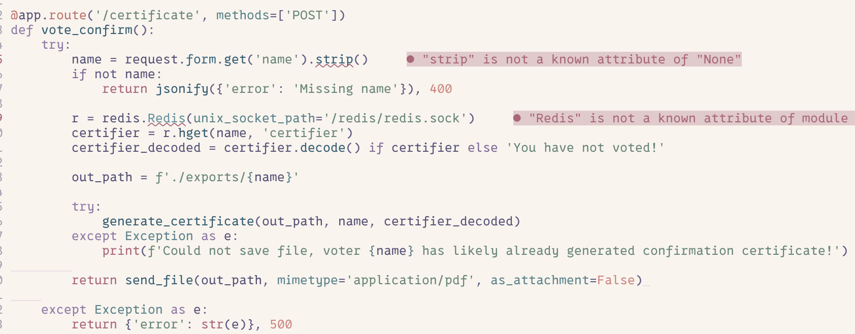Finally, the certificate. This route creates and saves a pdf of the name and the certifier in a pdf format if it is able to and sends that to the user.